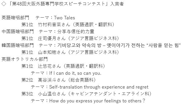 12月4日に「第48回大阪外語専門学校スピーチコンテスト」を鶴見区民センターのホールで開催しました。従来の英語オラトリカル部門、英語暗唱部門、中国語暗唱部門、韓国語暗唱部門、パフォーマンス部門に加えて、今回から新たに英語プレゼンテーション部門をエギジビションとして実施しました。また、3言語の暗唱課題を統一し、同じ内容を異なる言語で暗唱するという形式に変更しました。