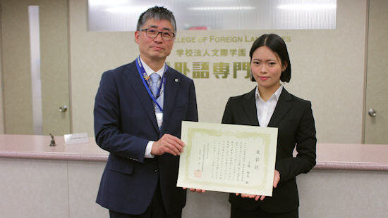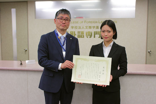 3月9日、本校校内にて表彰式が行われ、英語通訳・翻訳科2年の小猿桜花さんが、長年にわたるボランティア活動への貢献を称えられ、「独立行政法人国立青少年教育振興機構 理事長賞」を受賞しました。