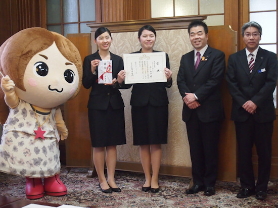 平成28年2月15日に滋賀県庁知事室応接室にて表彰式が行われ、三日月大造滋賀県知事より最優秀賞表彰状及び副賞の授与を受けました。